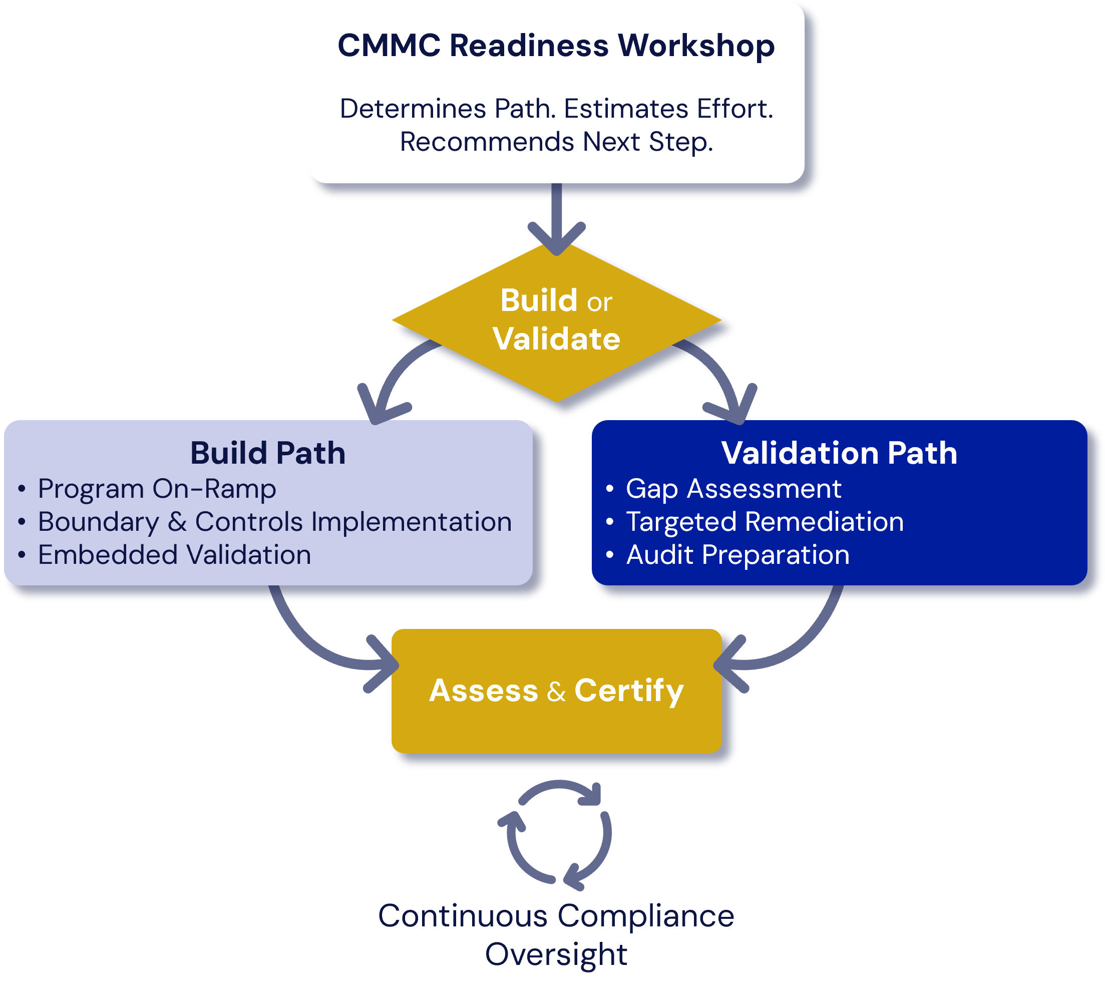 Schedule a free 60-minute CMMC readiness workshop today and discover whether your organization should Validate or Build a CMMC program.