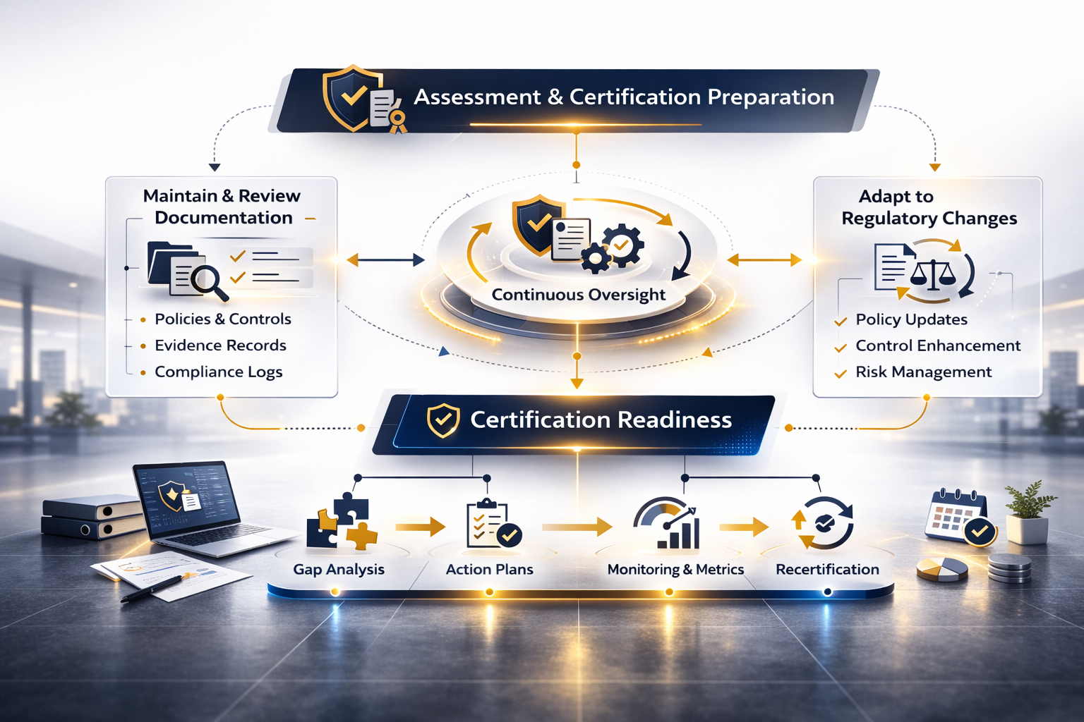 Certification is a milestone, not the finish line. After assessment, we support sustained readiness through ongoing oversight and measured governance.